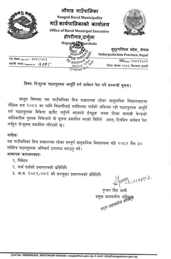Home » नि:शुल्क पाठ्यपुस्तक आपूर्ति गर्न आवेदन पेश गर्ने सम्बन्धी सूचना !
