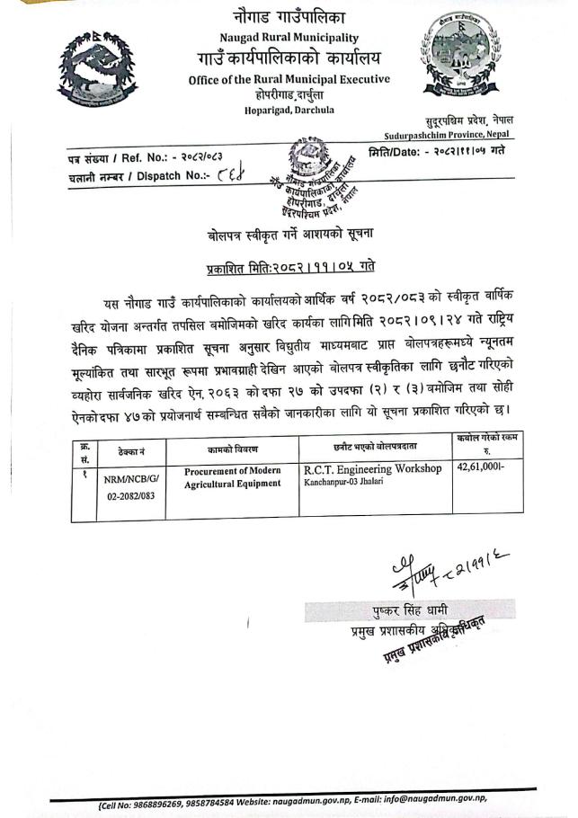 बोलपत्र स्वीकृत गर्ने आशयको सूचना !